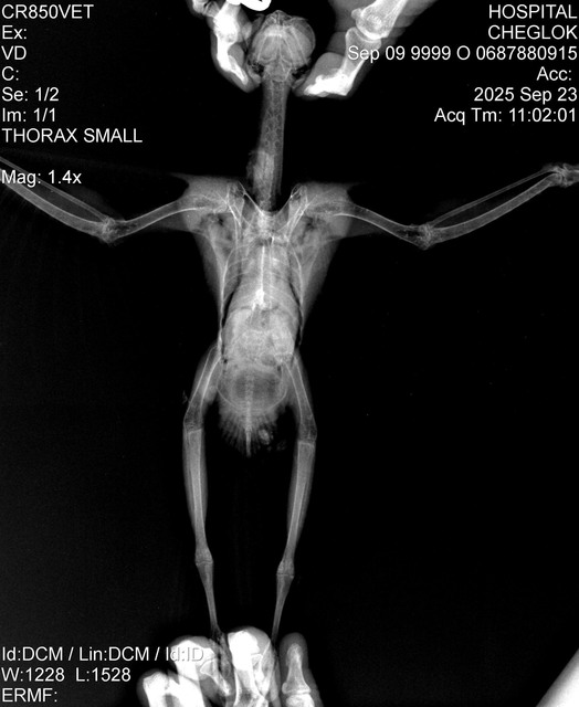 Травмоване ліве око (вже не відновиться), перелом коракоїда ("вороняча кістка", спеціфічна саме для птахів кістка, яка забезпечує кріплення кісток крила до скелету, і, відповідно, здатність до польоту), через травму, яка спричинила це все, судячи з усього -був пошкоджений повітряний мішок і виникла пневмонія, яка розповсюдилась на всю дихальну систему.