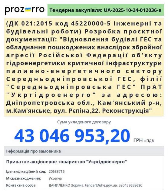 В системе Прозорро был проведен тендер «Розробка проєктної документації: "Відновлення будівлі ГЕС та обладнання пошкоджених внаслідок збройної агресії Російської Федерації об'єкту гідроенергетики критичної інфраструктури паливно-енергетичного сектору Середньодніпровської ГЕС, філії "Середньодніпровська ГЕС" ПрАТ "Укргідроенерго" за адресою: Дніпропетровська обл., Кам'янський р-н, м.Кам'янське, вул. Рєпіна,22. Реконструкція"».