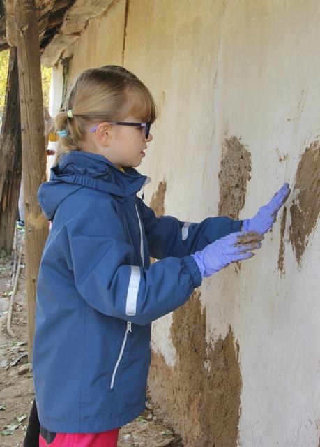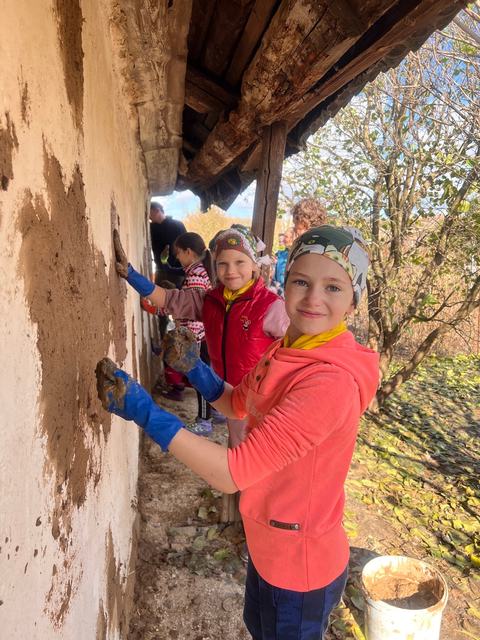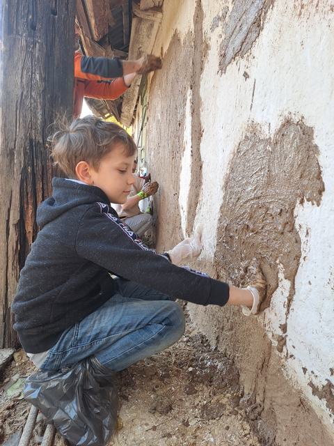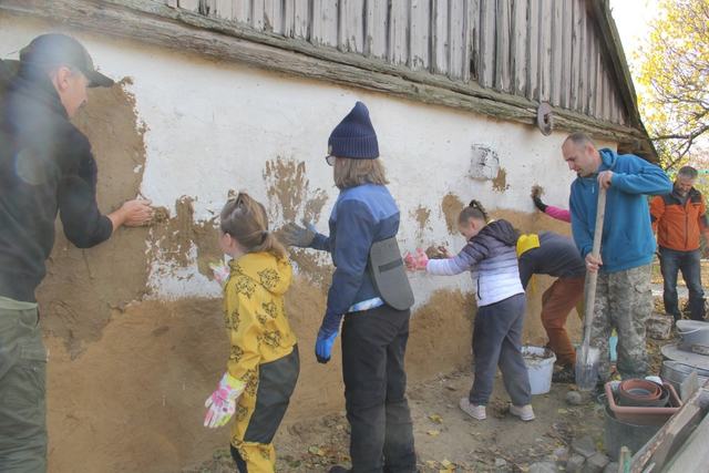 Дмитро коротко розповів, як працювати безпечно, показав техніку – і ми почали. Шістдесят пар рук, багато глини, трішки соломи – ііііі – уже за пів години хата мала нову глиняну шубку!