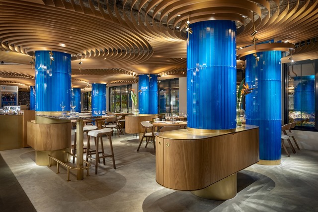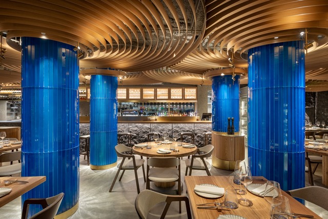 Із задоволенням ми працювали над складним і витончений дизайном ресторану, де унікальними є керамічні колони, стеля з дерев’яних ламелей та глибокі текстури скандинавського каменю.