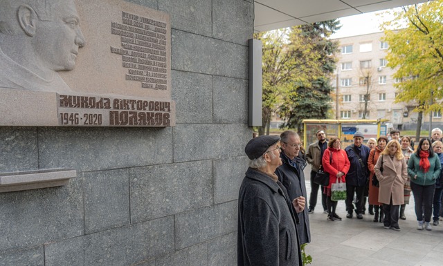 «У Дніпровський національний університет імені Олеся Гончара урочисто відкрили меморіальну дошку колишньому ректору, видатному вченому ММФ ДНУ – доктору фізико-математичних наук, члену-кореспонденту НАН України Миколі Вікторовичу Полякову.