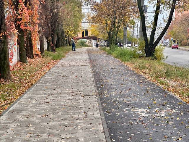 Теперь здесь полноценный тротуар в стандартной городской плитке и 1-сторонняя велодорожка, которая заложена в велоконцепции. Даже разметку нанесли.
