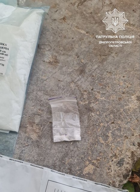 Слип-пакет и две пластиковые емкости с веществом кристаллического происхождения, похожим на наркотическое, патрульные обнаружили у жителя Днепра, которого остановили во время отработки вызова об ограблении на проспекте Слобожанском.