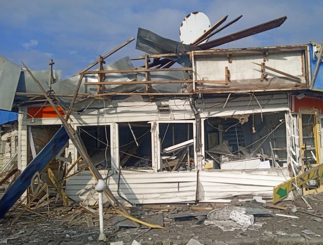 Изуродованы магазины и торговые павильоны, кафе, парикмахерская, пятиэтажка, автомобили.