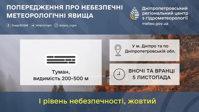 5 листопада вночі та вранці у м. Дніпро та по Дніпропетровській області очікується туман. Видимість в тумані 200-500 м.