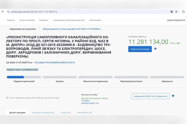 Планується відремонтувати каналізаційний колектор поблизу будинку №52. Замовником робіт вказане КП “Дніпроводоканал” міськради Дніпра. Ремонт оцінюється в 11 мільйонів 281 тисячу гривень.