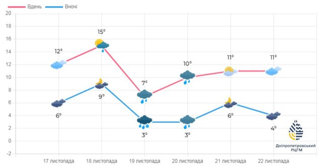 17–18 листопада, внаслідок виносу теплого повітря підвищаться температури: нічні до 8..12°, денні – до 11..16°. Але після проходження холодного фронту, у середу, очікується зниження температури: вночі до 0..4°, вдень до 2..7°.