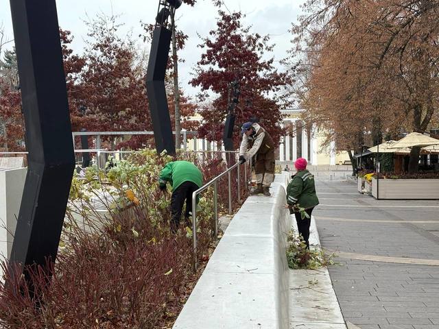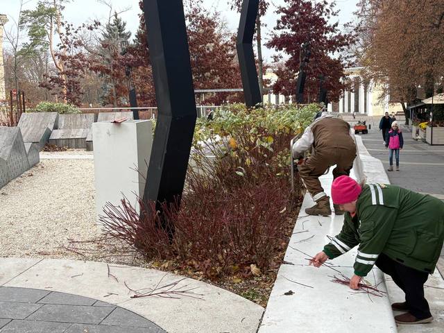 Во-вторых, осуществляется стрижка дерна белого сорта «Элегантисимо». Осенняя обрезка стимулирует появление новых побегов, которые зимой приобретают интенсивный красный цвет, формируя выразительный декоративный акцент в городском пространстве.