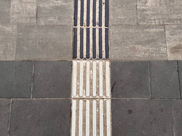 По нормам он должен быть другого цвета, чем остальной тротуар. Поэтому стандартная графитовая тактильная плитка на графитовой плитке не была бы контрастной. Поэтому выбрали белую тактильную плитку на графитовом мощении.