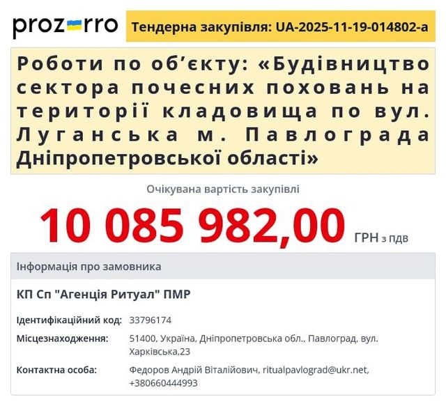 А в это время КП «Агенция Ритуал» Павлоградского горсовета выступает заказчиком обустройства сектора почетных захоронений на кладбище по улице Луганской. За это из бюджета готовы заплатить больше 10 миллионов гривен.