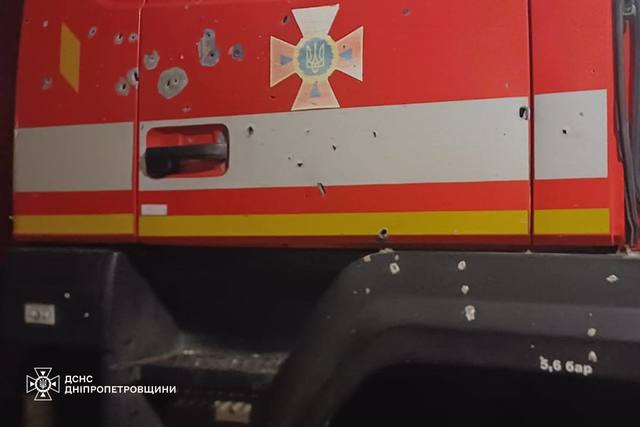 Поврежден пожарно-спасательный автомобиль. К счастью, сотрудники ГСЧС не пострадали - они успели перейти к укрытию.
