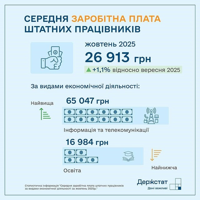 По Украине средняя заработная плата штатных работников в октябре выросла на 1,1% по сравнению с сентябрем, достигнув 26 913 грн. Об этом сообщает Государственная служба статистики во вторник, 2 декабря.