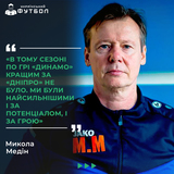 « Голкіпер Микола Медін потрапив до Дніпра зовсім юним ще у сезон другого союзного чемпіонства, а основним став якраз у розпал чемпіонату України 1992/93. Протягом кар'єри він неодноразово заходив знову у ту саму дніпровську річку – як гравець та як тренер. Але та зухвала команда, яка зовсім трохи не дотягнула до золота, назавжди залишилась для нього особливою.