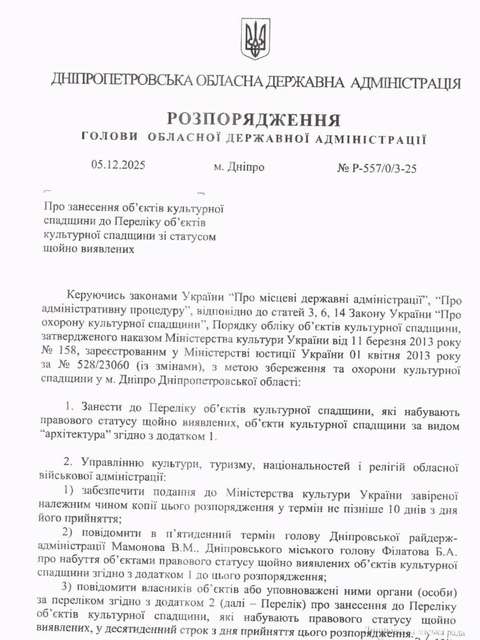 Відповідно до Розпорядження голови Дніпропетровської ОДА від 05.12.2025 №Р-557/0/3-25 на державний облік як щойно виявлені обʼєкти культурної спадщини, взято девʼять будівель, на підставі облікової документації, розробленої у 2025 році бюджетним коштом територіальної громади м. Дніпра.
