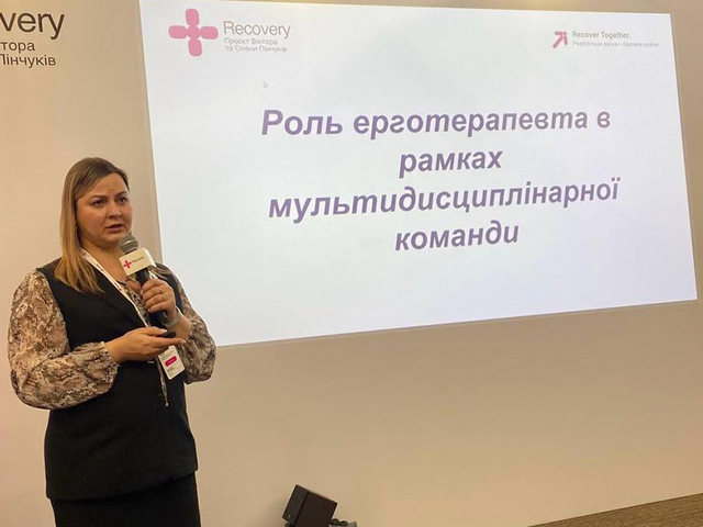 Анна Тоцька у доповіді «Роль ерготерапевта в рамках мультидисциплінарної команди» розглянула, як спільна робота фізичного терапевта, лікаря ФРМ, психолога, ТММ, соціального працівника створює цілісний маршрут для повернення людини до максимально можливого рівня функціонування.