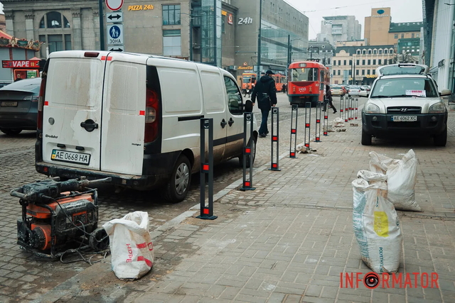 В Днепре на улице Центральной начались работы по установке антипарковочных столбиков.