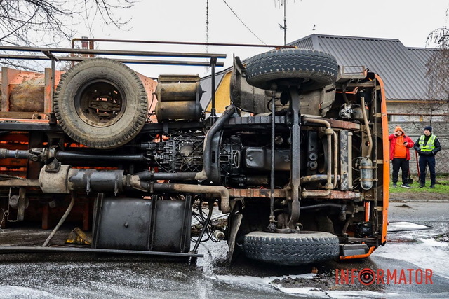 По предварительной информации, КамАЗ ехал по Деревлянской (Киринаковская), поворачивал на Посполитую и при повороте перевернулся на бок.