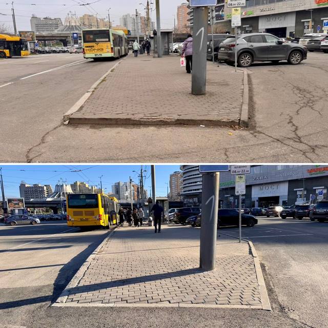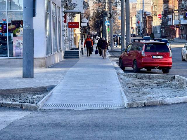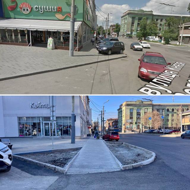 Здесь сделали антикарман, снизили бордюр на нем и напротив (в сторону остановки городского транспорта), также снизили бордюры на перекрестке с Европейской улицей, зонировали тротуар, сделали лунки для озеленения и шесть параллельных паркомест.