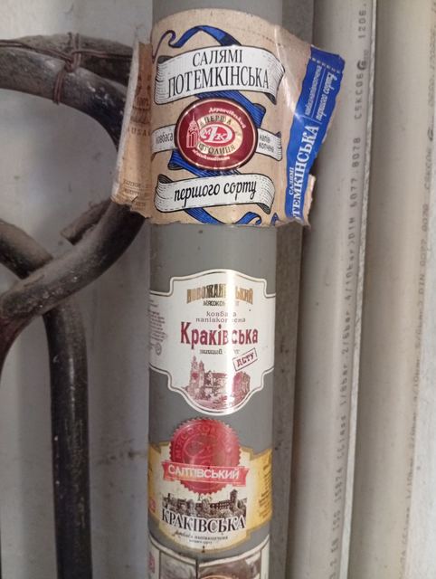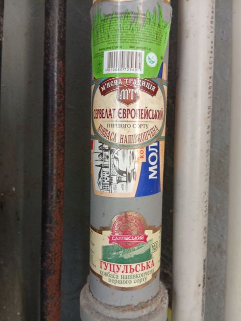 Такую достаточно давнюю (судя по ряду признаков) коллекцию колбасных этикеток я обнаружил на водопроводной трубе в одном из подсобных помещений у себя на работе в театре.