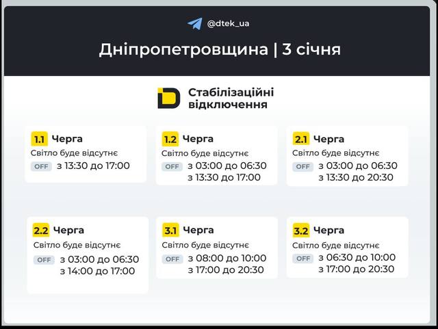 3 січня, у більшості регіонів України будуть застосовуватись графіки погодинних відключень та графіки обмеження потужності (для промислових споживачів).