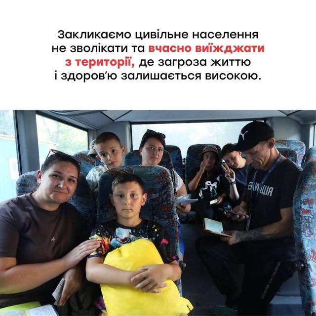 Вчасна евакуація з прифронту – це порятунок життя. Закликаємо цивільне населення не зволікати та вчасно виїжджати з території, де загроза життю і здоровʼю залишається високою.