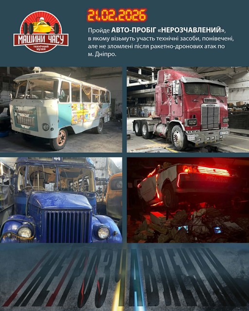 Авто- пробіг "Нерозчавлений" пройде 21 лютого о 14:00, в ньому візьмуть участь технічні засоби, понівечені, але не зломлені після ракетно-дронових атак по м. Дніпро.