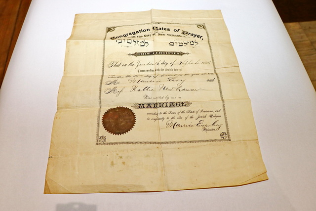 Нинішній дар Музею є офіційним документом про шлюб, укладений 14 вересня 1886 року, що відповідає 14 дню місяця елул 5646 року за єврейським календарем. Свідоцтво засвідчує шлюб Моріса Леві та Хетті Ньюгаузер, членів єврейської громади міста Новий Орлеан, штат Луїзіана, США. Документ оформлено у вигляді друкованого бланка з рукописним заповненням і засвідчено підписом служителя громади Моріса Айзенберга, який підтвердив укладення шлюбу відповідно до законів штату Луїзіана та обряду, проведеного в конгрегації «Врата Молитви» (Congregation Gates of Prayer). Ця конгрегація існує й сьогодні, однак не належить до ортодоксальних течій у юдаїзмі, тож передане свідоцтво не є традиційною ктубою, проте воно залишається цінним історичним джерелом, що відображає практики фіксації шлюбів у єврейських громадах Північної Америки другої половини XIX століття.