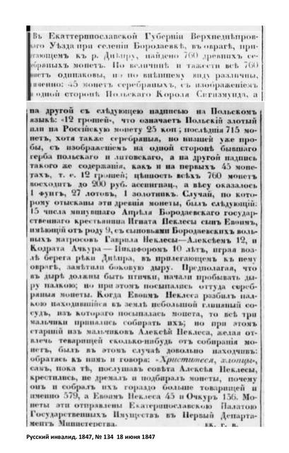 «У Катеринославській губернії Верхньодніпровського повіту при селищі Бородаївці, у яру, що прилягає до р. Дніпра, знайдено 760 давніх срібних монет. За розміром і вагою всі вони однакові, але за зовнішнім виглядом різні, а саме: 45 монет — із зображенням польського короля Сигізмунда та написом «12 грошей» (що означає польський злотий, або 25 коп. на російські гроші); решта 715 монет — також срібні, але нижчої проби, з гербом Польщі та Литви й аналогічним написом «12 грошей». Вартість знахідки сягає 200 руб. асигнаціями, а загальна вага склала 1 фунт 27 лотів 1 золотник.
