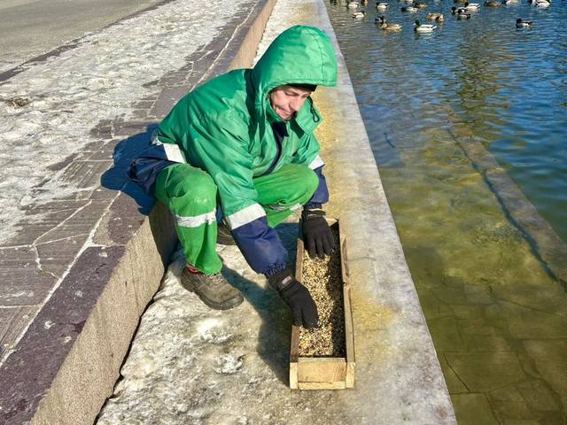 У ці морозні дні працівники парку Глоби дбають про водоплаваючих птахів та підгодовують їх, задля збереження їхньої популяції.