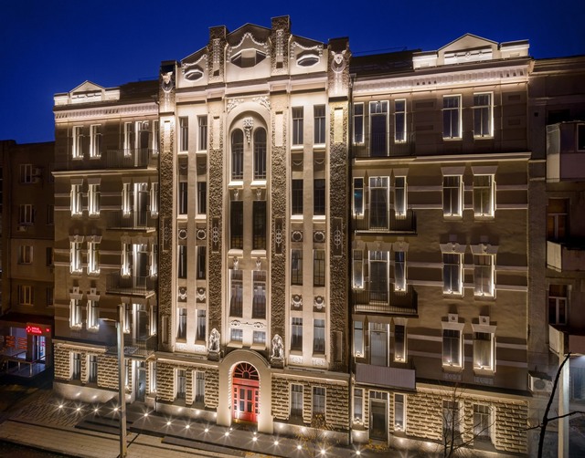 Ця будівля — одна з ключових пам’яток харківського модерну початку ХХ століття. Вона формує характер середовища і працює як частина цілісного образу центру міста. Наше завдання полягало в тому, щоб світло делікатно підкреслило архітектуру, не втручаючись у її логіку та пропорції.