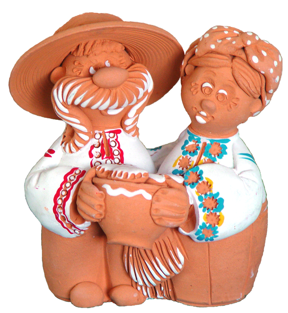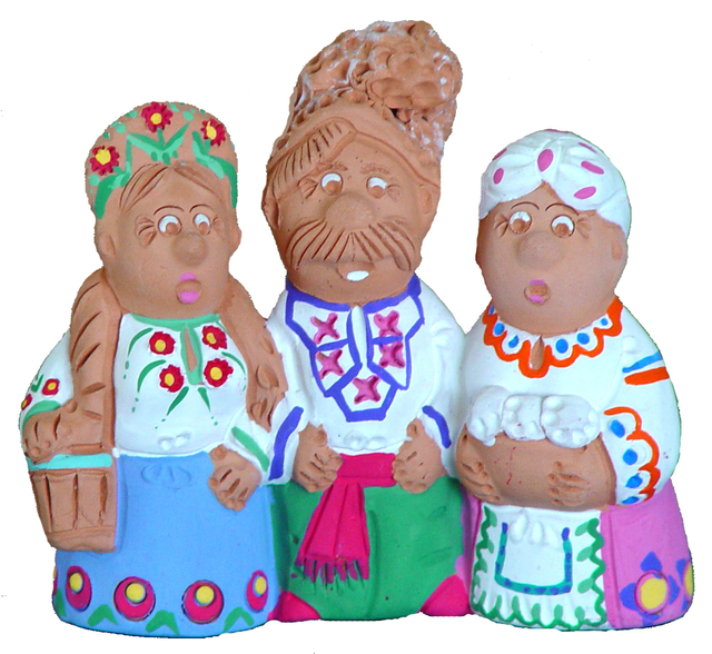Кукол для нашей коллекции я купила в Знаменитом Керамическом техникуме имени Гоголя. Это одно из немногих учебных заведений, в котором готовили специалистов для фарфоровых, керамических заводов. Он основан в 1896году. В нем же размещен музей керамики. В семи комнатах многочисленные работы дипломников этого техникума. Некоторые работы можно было купить, что я и сделала. Фигурки сделаны из терракота, то есть из природной глины с добавкой красителя. Затем они расписаны. Это «щирi украинци». Трио с широко раскрытыми глазами –семейка из гоголевской «Сорочинской ярмарки»- Хавронья Никифоровна, ее муж Черевик и падчерица Параска. Эта пара –«Чоловiк та жiночка» держат в руках котелок с варениками. Они гостеприимны и щедры. У всех фигурок расшитые цветочками рубахи.