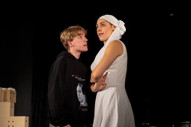 Окремо, варто відмітити одяг акторів. Білі сукні - для дружин поетів, які виконують роль ангелів-охоронців. А чорні худі - з фото та цитатою - для митців. Як уніформа і водночас сучасний одяг. Їх протягом вистави вдягають на себе актори.