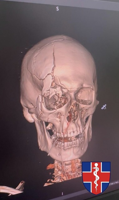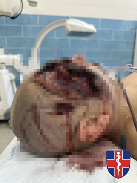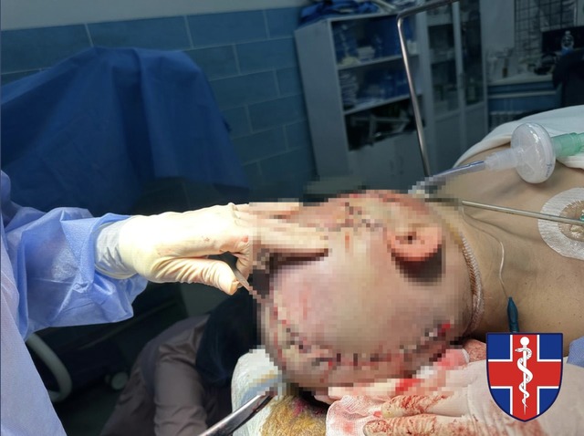 Пізно ввечері реанімаційний екіпаж доставив важкого пацієнта на апараті штучного дихання. Після стабілізації стану було встановлено діагноз: відкрита черепно-мозкова травма, проникаюче вогнепальне уламкове поранення лобної ділянки з руйнуванням очниці та обширним дефектом м’яких тканин.