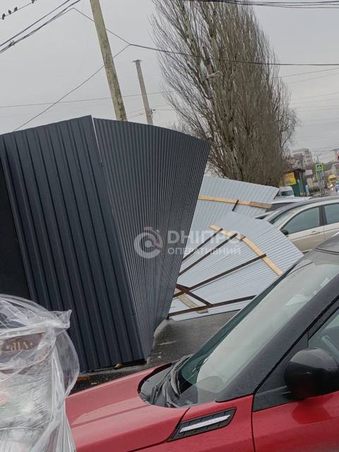 На вулиці Старочумацькій сильний вітер повалив огорожу однієї з оптових баз. Паркан впав безпосередньо на припарковані поруч автомобілі, завдавши транспортним засобам пошкоджень.
