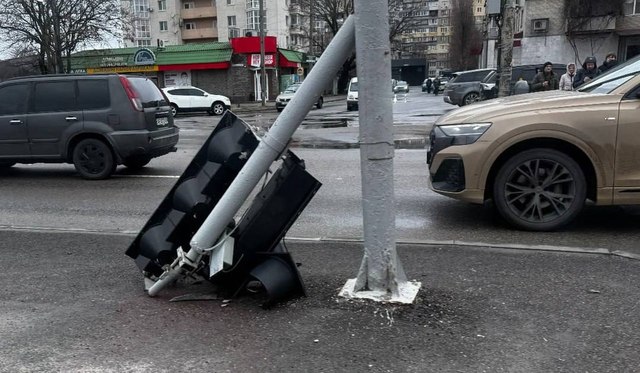 Схожа ситуація і на проспекті Слобожанському. Під тиском вітру не втрималася конструкція світлофора.