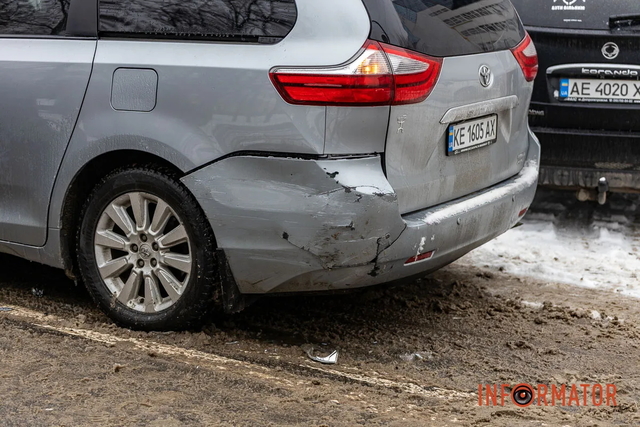 Столкнулись три автомобиля: Citroen, Toyota и Skoda. В результате ДТП образовалась сильная пробка, которая тянулась со стороны проспекта Дмитрия Яворницкого. У Citroen вырвало переднее колесо.