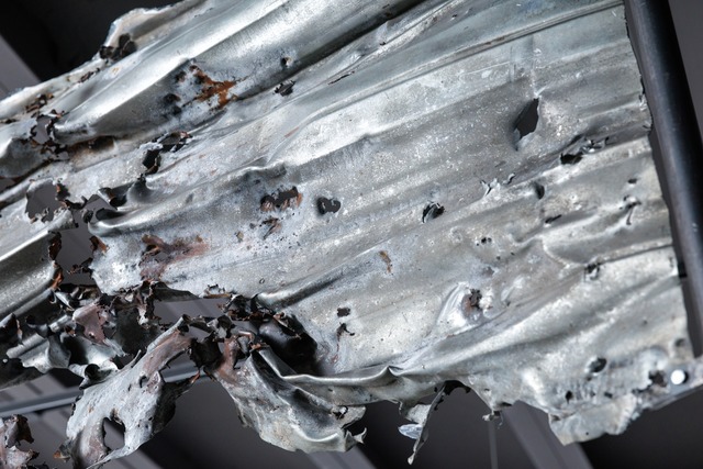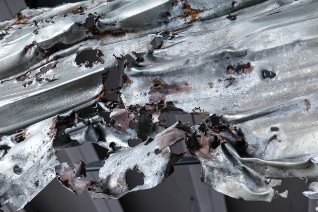Відтоді художник працює з матеріалами, які були позначені чи трансформовані війною — розплавлені вибухами, розірвані вибуховою хвилею, прошиті кулями. Ця брутально сформована матерія стає основою «прапорів» Кадана: праць, які частково є знайденими об’єктами (found objects), а частково — матеріальними доказами у справі самої війни, яка досі триває.