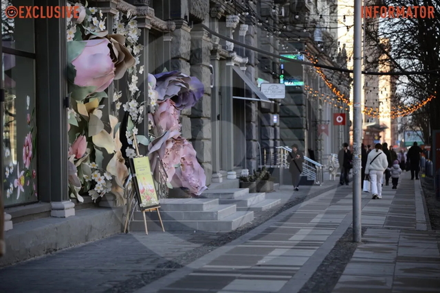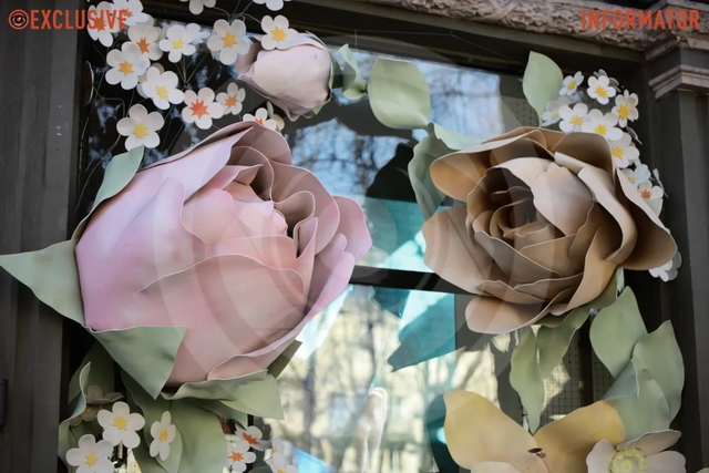 Композиция состоит из гигантских пионов, роз и других цветов. Они закреплены на фасаде строения и дополнены маленькими декоративными элементами. Цветы имеют нежные пастельные цвета – розовый, бежевый и белый.