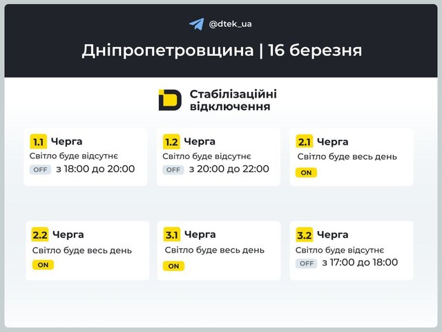 Увага! Час та обсяг застосування обмежень можуть змінитись. Стежте за інформацією на офіційних сторінках ДТЕК, ЦЕК.