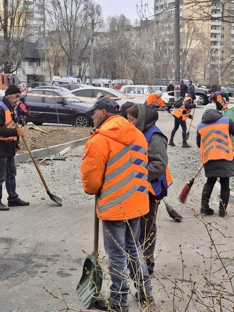На місці працюють усі профільні служби та благодійники. Комунальники прибирають скло, гілля та уламки. Задіяно й важку техніку — навантажувачі, евакуатори та самоскиди.