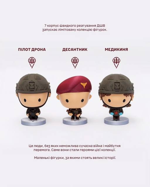 В коллекции – десантник, пилот дрона и медик. Получить их можно не в магазине, а за донат от 5000 грн на ударные дроны - как благодарность от военных за поддержку, передает КУСТ МЕДИА.