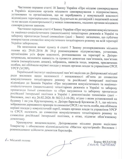 “Вывод, письмо от 26.02.2026 № 582/2.2-10-26), согласно которому установлен на здании 1 по Кругогорному, г. Днепр барельеф Брежнева Л. И., содержащий изображение государственного флага и символов СССР, и в честь лица, занимающего власти руководителей УССР и СССР, входит в символику коммунистического тоталитарного режима и символику российской имперской политики, а значит, подлежит обязательному демонтажу”, — говорится в документе от городского совета.