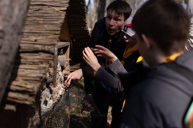 А також займалися ремонтом готелю. Але цей готель розрахований не на людей, а був спеціально створений у Ботсаду для корисних комах.
