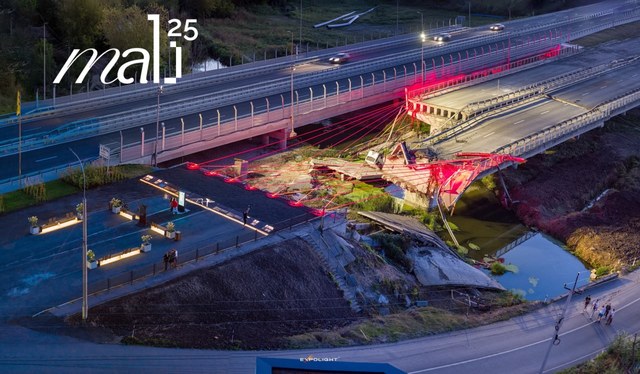 Меморіальна інсталяція “Дорога Життя” на місці зруйнованого Романівського мосту в Ірпіні перетворила його на символ зцілення та відродження. Червоні нитки світла пульсують, як шви на рані, нагадуючи: бетон можна зламати, але волю — ніколи.