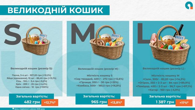 Что касается стоимости пасхальной корзины в этом году, то бюджетный вариант, который включает паску, десяток крашенок, соль, хрен и свечу, стоит в среднем 482 грн - на 12,7% дороже, чем в 2025 году. Если добавить твердый сыр, колбасу и горчицу, корзина будет стоить 965 грн (+13,8% к прошлому году). А максимальное наполнение с кагором, свежими огурцами, томатами и салом увеличит расходы до 1 387 грн, что на 17% дороже, чем в прошлом году.