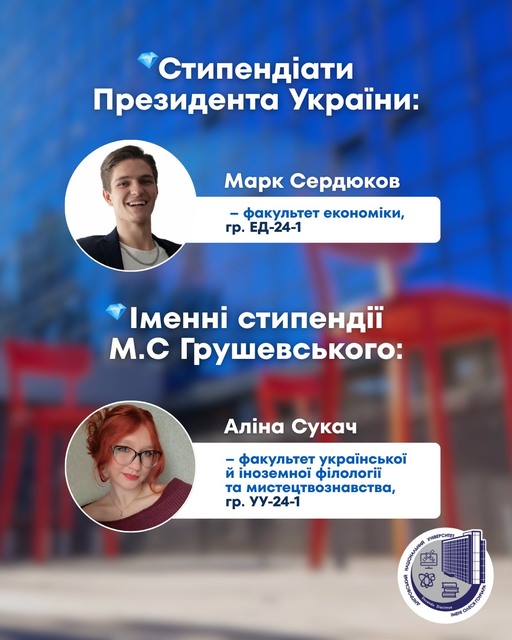 ДНУ пишається своїми здобувачами освіти, які отримали престижні відзнаки держави – академічні стипендії Президента України та іменні стипендії М.С. Грушевського!