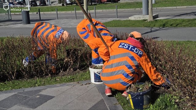 У зелених зонах Дніпра триває весняне прибирання. Зараз активні роботи проводять на Набережній Перемоги. Тут працюють дев’ять фахівців по всій протяжності локації.
