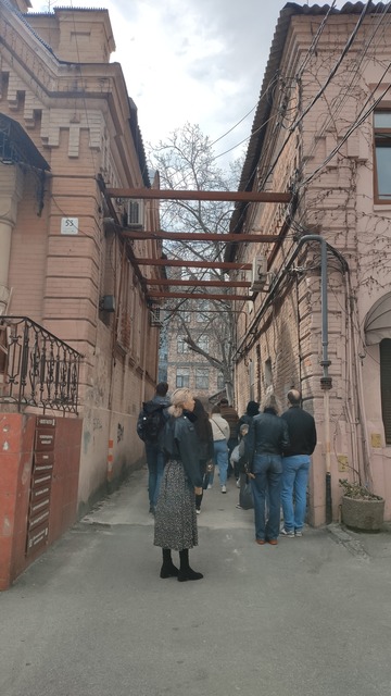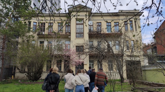 На нашому маршруті проти колишнього Острожного майдану ми раптом були заскочені тим, як потужно й яскраво вибухнула весняним квітом магнолія. Ніби дарунок місцевому митцеві, співцеві катеринославських двориків Михайлові Кубликові. Ошатна оселя Івана Езау зберігає пам'ять про небезталанного міського голову і його суперталановиту вчену доньку-американку. За її підручниками з анатомії рослин навчалися ще студенти радянської пори. Як багато талантів змушено полишає Україну в усі часи!