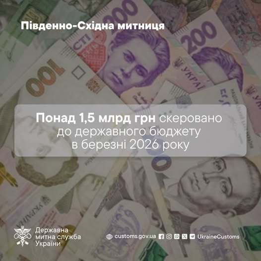 Завдяки цьому за січень-березень 2026 року Південно-Східна (Дніпровська) митниця перерахувала до бюджету понад 4,1 млрд грн митних платежів, порівняно з аналогічним періодом минулого року надходження збільшились на 2% (січень-березень 2025 року понад 4 млрд грн).