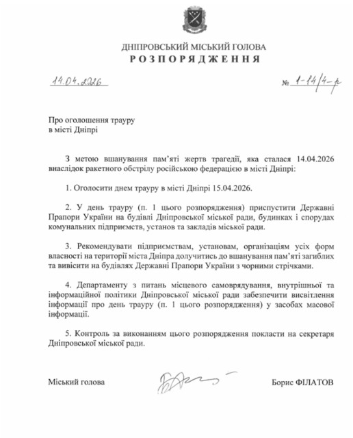 Завтра в Днепре объявлен день траура. Об этом говорится в распоряжении мэра Бориса Филатова.